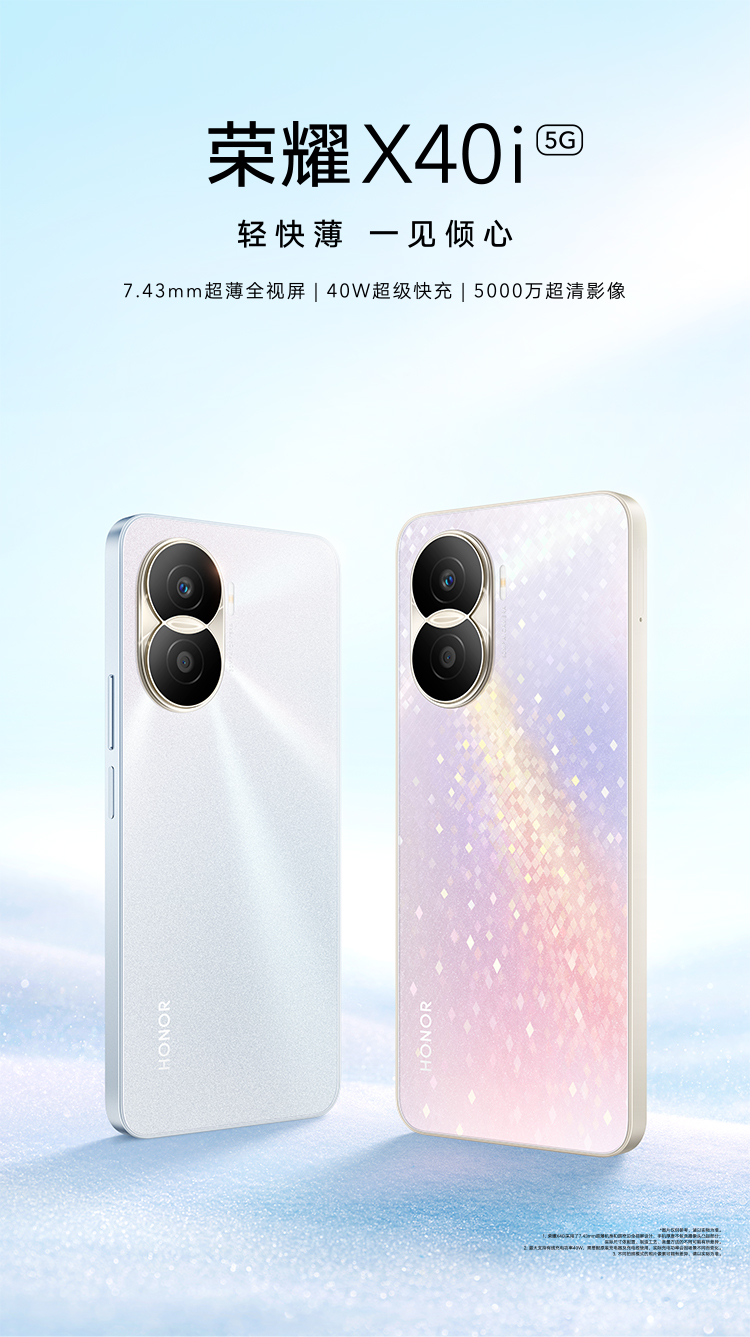 荣耀X40i 7.43mm超薄全视屏 钻彩星河设计 40W超级快充 5000万超清影像 5G手机 12GB+256GB 玫瑰星河